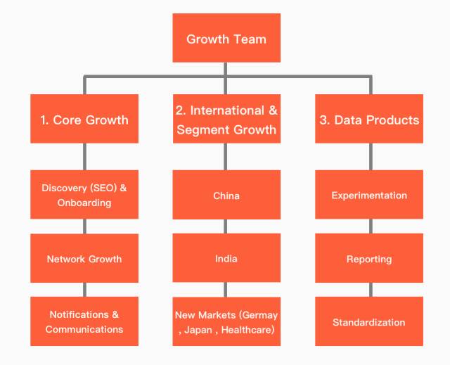 LinkedIn 的增长团队目前有一百多人,划分为 3 个大组,分别是核心增长( Core Growth )、国际化( International & Segment Growth )和数据产品( Data Products ),每个组都有自己的核心任务。